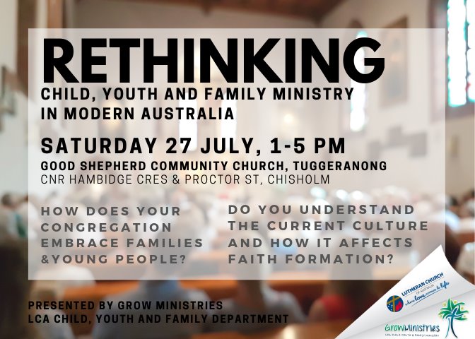 We welcome Grow Ministries to Good Shepherd to present a conference on rethinking children's and family ministry. - How does your congregation embrace families and young people? - Do you understand the current culture and how it affects faith formation? Attendance is free. There will be opportunity on the day to donate to help offset... Read more